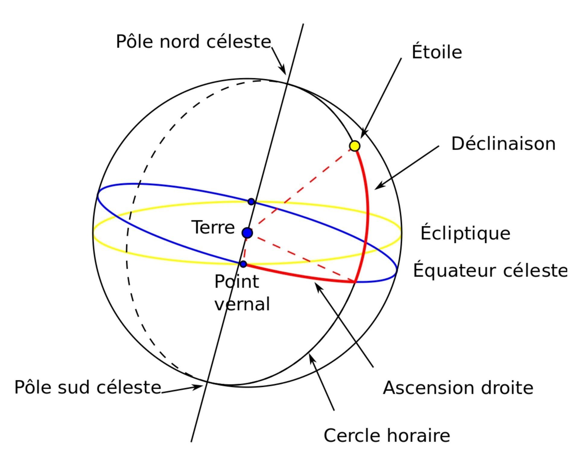 hémisphères, chacun ayant comme axe de référence la projection d'un pôle terrestre, perpendiculaire à l'équateur céleste. À partir de ces divisions, le système permet d'établir deux coordonnées angulaires : l'ascension droite et la