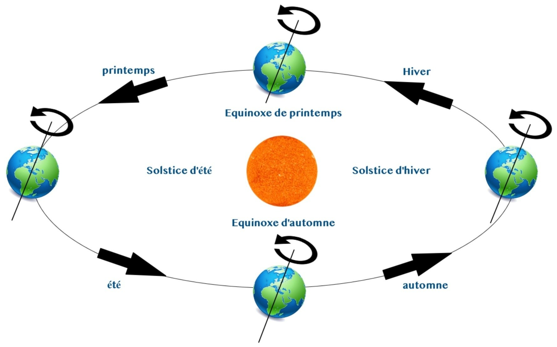 Au cours de sa révolution autour du Soleil, la Terre ne présente donc pas toujours la même configuration au Soleil : on dit que l'exposition solaire de la Terre change, c'est ce qui explique les saisons.