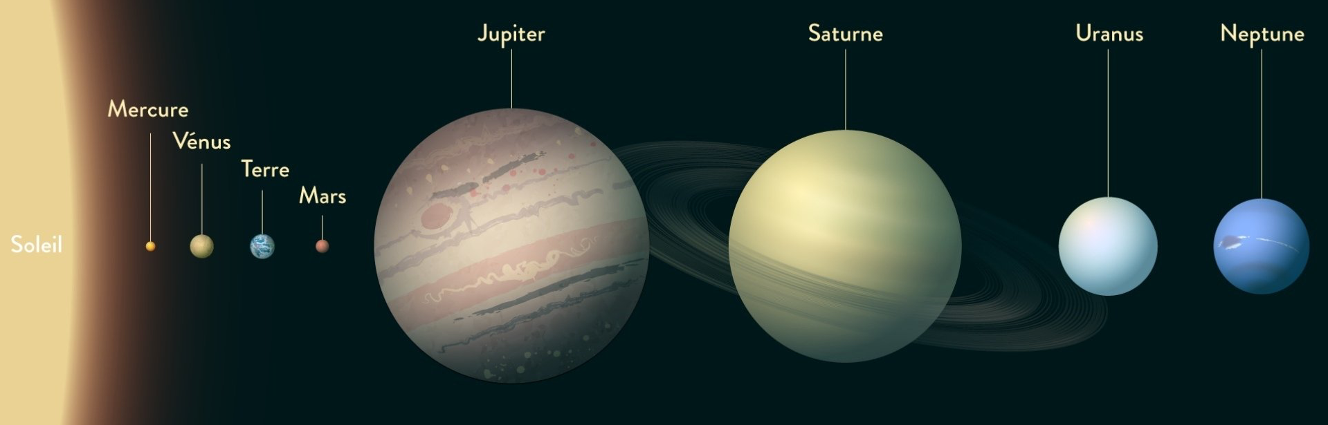 - Huit planètes -- et leurs satellites naturels ; il y en a plus de 175 connus -- que sont Mercure, Vénus, la Terre, Mars, Jupiter, Saturne, Uranus et Neptune, par ordre d'éloignement au Soleil. Les quatre premières sont qualifiées de planètes telluriques, les quatre dernières, de planètes gazeuses.
