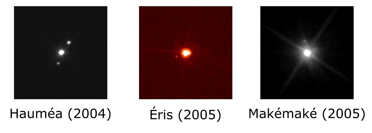 Initialement, trois planètes naines sont désignées — Cérès, Pluton et Éris — auxquelles se sont ensuite ajoutées en 2008 Hauméa et Makémaké, ce qui porte à cinq le nombre d'objets reconnus comme planètes naines par l'UAI.