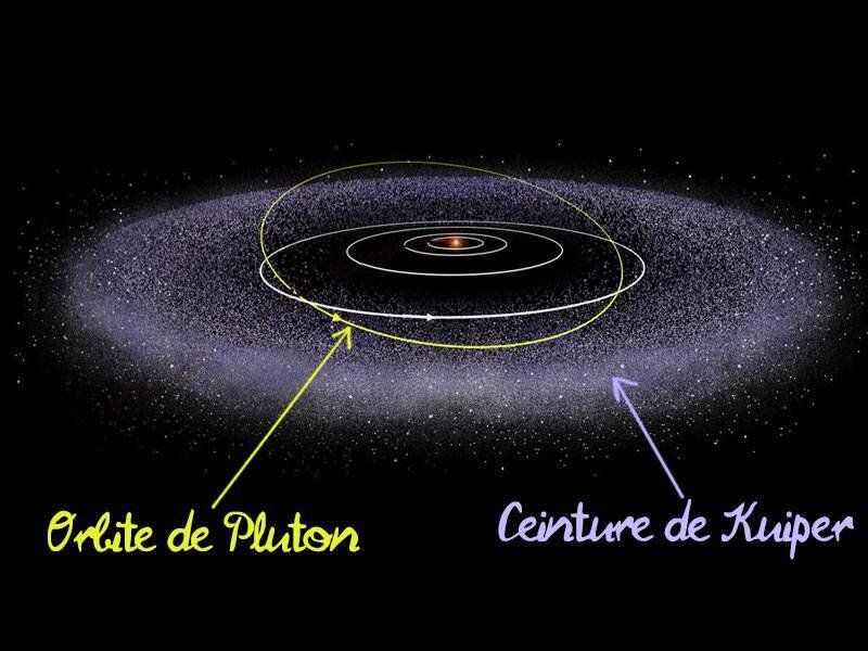 La ceinture de Kuiper s'étend aux confins du Système solaire, au-delà de l'orbite de Neptune, entre 30 et 55 UA (1 UA correspond à la distance moyenne entre la Terre et le Soleil). Outre Pluton, au moins trois autres planètes naines occupent cette région peuplée de centaines de milliers de corps glacés de plus de 100 km et de plusieurs milliards de comètes (leur période orbitale est d'environ 200 ans). Leur origine date de la formation de notre Système solaire, il y a près de 4,6 milliards d'années.