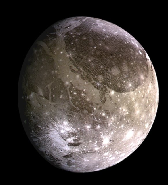 Ganymède, avec ses 5 262 km de diamètre, est le plus grand satellite de Jupiter, et également le plus grand du système solaire. Plus grand que la planète Mercure, il fait moins de la moitié de sa masse (un peu moins de 150 milliards de milliards de tonnes, contre 330 pour Mercure). Sa densité (environ 1,95) est faible comparée à celle des planètes rocheuses.